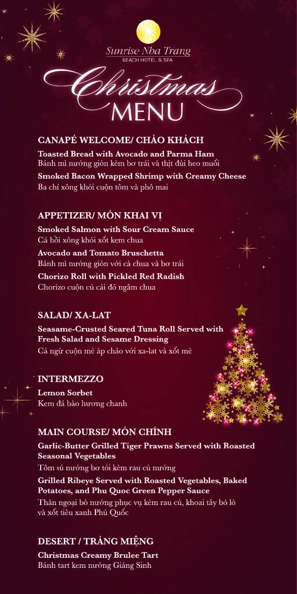 Ignite the festive season at Sunrise Nha Trang. Celebrate the warmth of Christmas with a cozy Christmas Eve dinner, then welcome the New Year with an unforgettable gala celebration. Let us create moments to cherish with your loved ones. Book your stay now for a truly memorable holiday season.